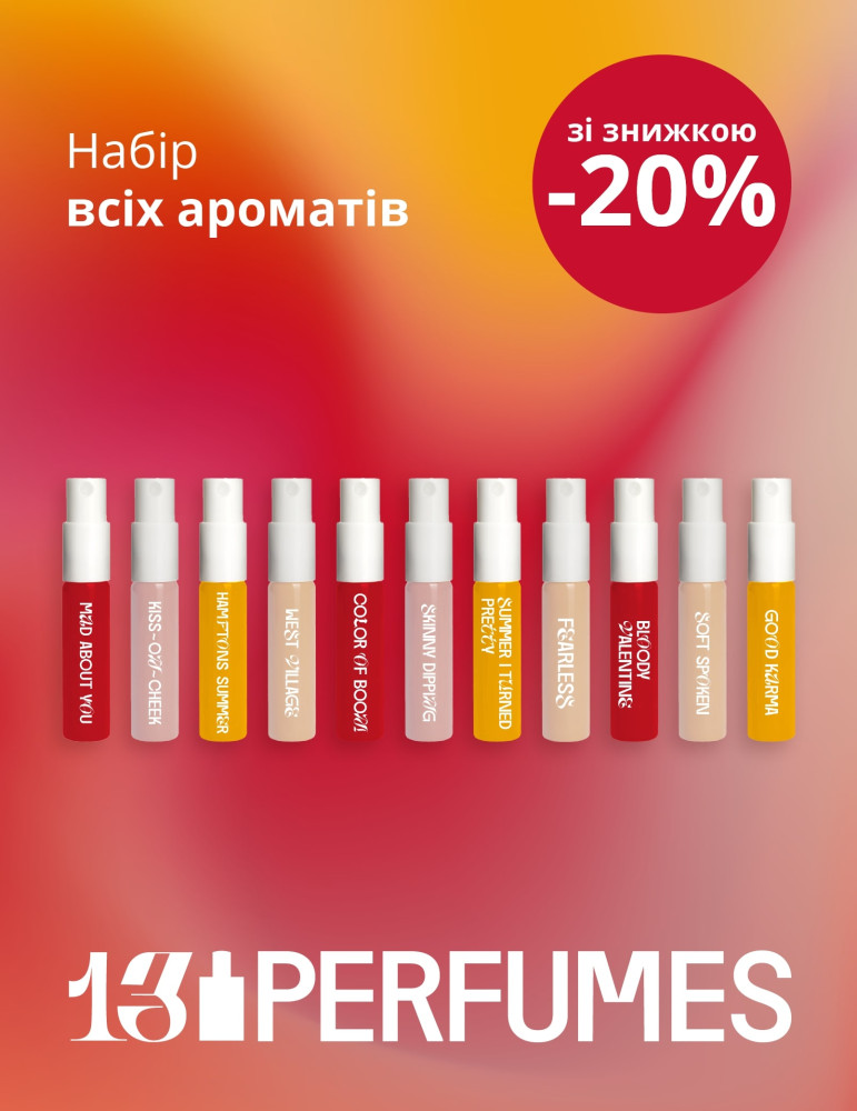 13PERFUMES пропонує нішеву парфумерію, яка відкриває світ незвичних поєднань. Тут зустрічаються свіжість цитрусових, глибина деревних нот, ніжність квітів і акценти спецій. Кожен аромат створений так, щоб дивувати, змінюватися протягом дня і залишати яскраве враження ✨.