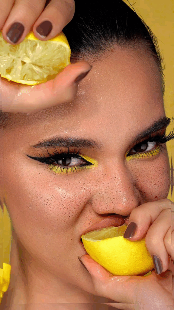 - Лимонно-жовтий: це сміливий колір-акцент. Використовуйте його як підводку для очей для створення ефектних графічних стрілок, або нанесіть невелику кількість блискучих лимонних тіней у внутрішній кутик ока, щоб “розкрити” погляд.