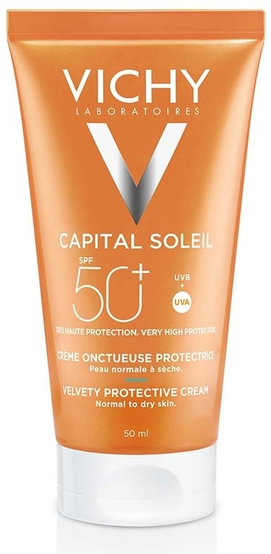- Vichy Capital Soleil Velvety Cream SPF50+ – це засіб із потрійною дією та високим фактором захисту від сонця SPF 50+, призначений для догляду за шкірою обличчя. Ціна: 637 грн.