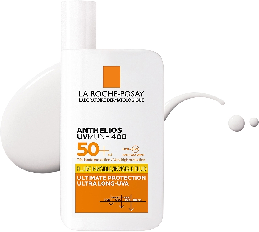 - La Roche-Posay Anthelios UVmune 400 Invisible Fluid SPF50+ Fragrance Free – легкий сонцезахисний флюїд без запаху, що забезпечує високий рівень захисту від UVB і дуже довгих UVA променів. Ціна: 829 грн.